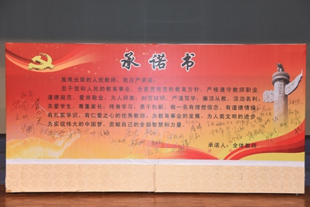 最后,在张颖校长的领誓下,全体教职工面对国旗、党旗承诺宣誓:忠于党和人民的教育事业,全面贯彻党的教育方针,严格遵守教师职业道德规范。爱岗敬业,为人师表;刻苦钻研,严谨笃学;廉洁从教,淡泊名利;关爱学生,尊重家长;终身学习,勇于创新。做一名有理想信念、有道德情操;有扎实学识、有仁爱之心的优秀教师。为教育事业的发展,为人类文明的进步,为实现伟大的中国梦,贡献自己的全部智慧和力量。校领导和教师代表们在大型承诺书上郑重地签上了自己的名字,启动仪式在《没有共产党就没有新中国》的歌声中圆满结束。