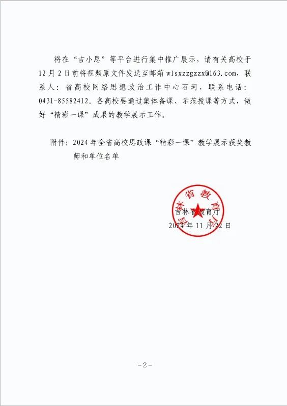 近日,吉林省教育厅公布了2024年全省高校思政课“精彩一课”教学展示活动结果,我校马克思主义学院教师荣获二等奖3项、三等奖1项。