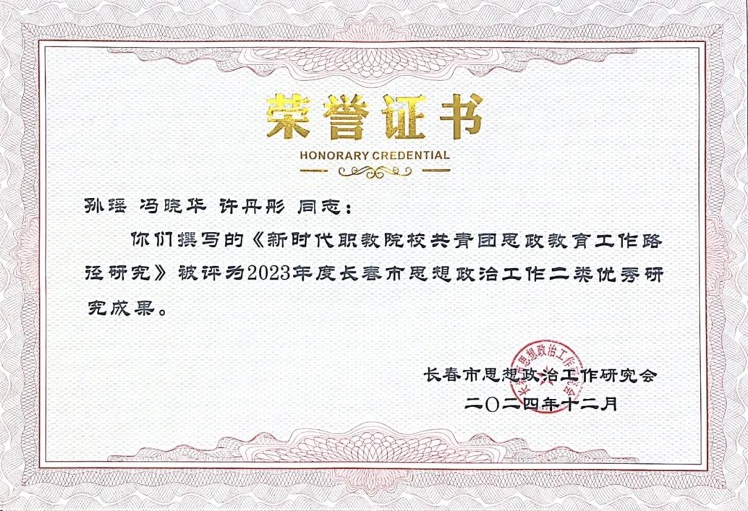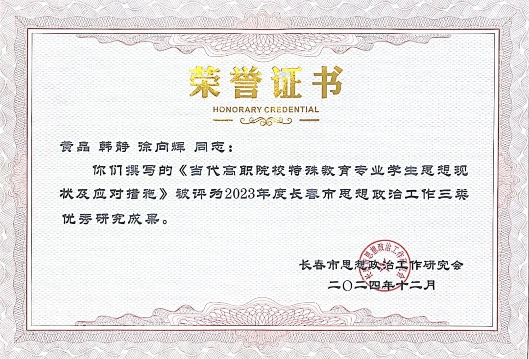 近日,由长春市思想政治工作研究会主办的2023年度长春市思想政治工作优秀研究成果评选活动结果公布,我校孙瑶、冯晓华、许丹彤撰写的《新时代职业院校共青团思政教育工作路径研究》被评为“长春市思想政治工作二类优秀研究成果”。黄晶、韩静、徐向辉撰写的《当代高职院校特殊教育专业学生思想现状及应对措施》和朱春艳、温薪田、孙菲撰写的《习近平新时代中国特色社会主义思想对外传播吉林经验》被评为“长春市思想政治工作三类优秀研究成果”。